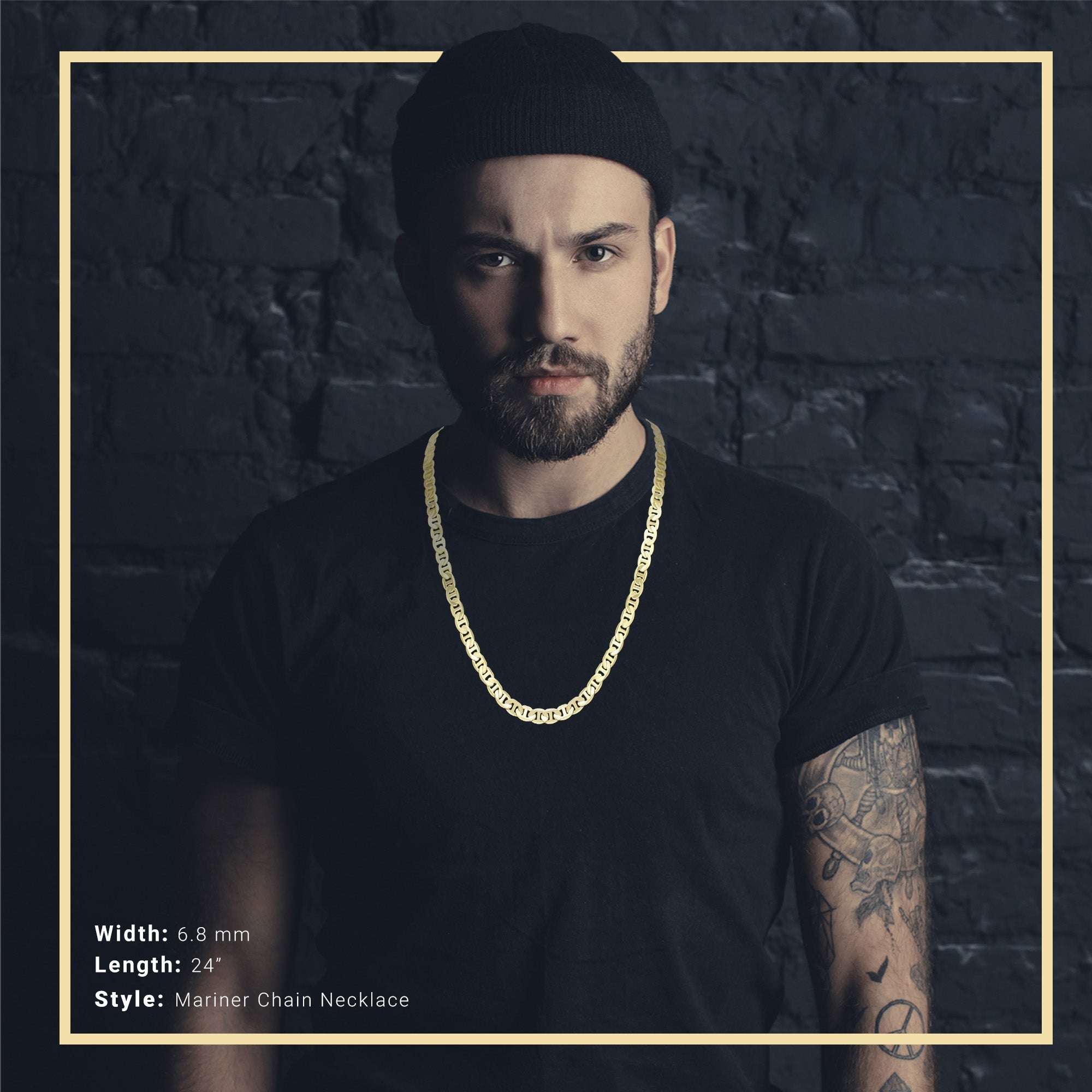 Our Mariner Necklace for men is 24" long and is available in 6.8 mm size.